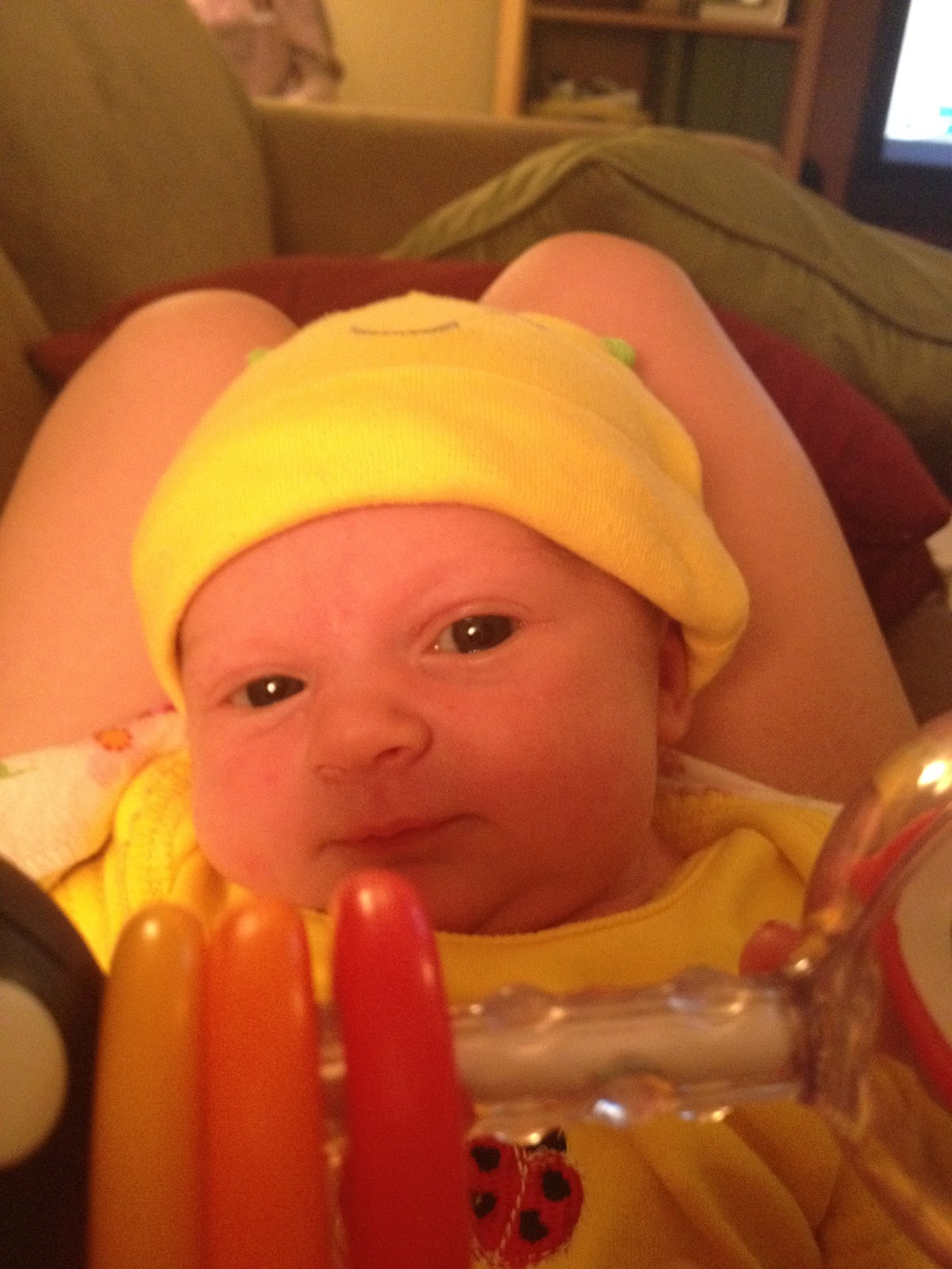 Here is our sweet angel in her 3 week photo! We are having so much fun with this little girl. We can't stop looking at her and kissing her chubby cheeks. She is so fun to photograph (hence all the pictures that look exactly alike). She is a great sleeper...during the day. At night, not so much. She just wants to be held constantly so when she wakes up in her bed and realizes she's not being held, she goes nuts. She still wakes up about 3 times a night which isn't too bad, but I won't lie...it will be great once she can sleep through the night! She loves her bouncy seat. She isn't too fond of her swing yet which is really surprising because she loves to be rocked and swayed. It's a mystery :) We have still been out and about and she is awesome when we go out. Just sleeps the whole time.